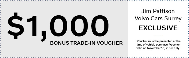 †Based on the current condition, buyout, and accident history of customer’s current vehicle. *0.49% lease/finance rate (includes 1.5% reduction from Targeted Loyalty Program) applicable to qualifying customers on new 2025 XC40 B5 AWD Ultra models for up to 48/84 months, provided through Volvo Car Canada Limited on approved credit. The Volvo Targeted Loyalty Program is for eligible customers that currently lease or finance a Volvo through Volvo Car Financial Services. **$18,500 cash purchase savings include $17,500 cash purchase savings with $1,000 Targeted Loyalty Program cash purchase savings, applicable on new 2025 EX90 models. ¹Trade-in bonus/voucher must be mentioned or presented at the time of vehicle purchase. ²Complimentary 3-Service Prepaid Maintenance applicable to all new Volvo models. ^Customers who purchase/lease/finance a new Volvo receive once a year complimentary detail and shampoo for 4 years. Value is $1,600. ‡All customers who register and attend the event will be entered to win 1 of 5 $100 gas card or 1 of 4 $500 Save-On-Foods gift card. The draw for the prizes will be made within a week after the sales event ends from those who registered for the event, and the winner will be contacted accordingly. The winner of the contest will be required to correctly answer a skill-testing question before the prize will be awarded. No cash value. Offers valid on November 15, 2025 only. Some conditions and restrictions may apply. Errors and omissions excepted. Offers subject to change or cancellation without notice. Contact Jim Pattison Volvo Cars Surrey for complete details.