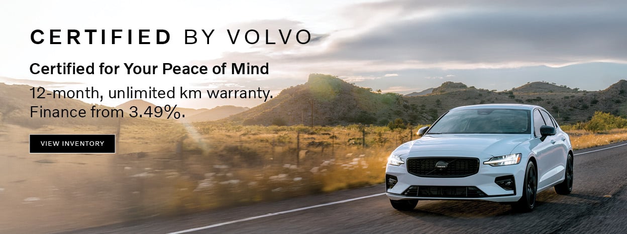 *Limited time finance offer available through Volvo Car Canada Limited, on approved credit. Selling Price includes retailer administration fee; as well as all other applicable fees, levies and duties (all of which may vary by retailer). License; insurance; registration including lien registration fee (up to $75) and lien registering agent fee; and applicable taxes are extra. Financing from 3.49% APR includes 0.5% reduction for loyalty offer. Loyalty offer only available to the eligible customers on the purchase of a new Certified by Volvo vehicle in Canada. Dependant on retailer stock availability, order/trade may be necessary (but may not be available in all cases). Conditions apply. Offer ends December 31, 2025 and is subject to change or cancellation without notice. Contact us for complete details.