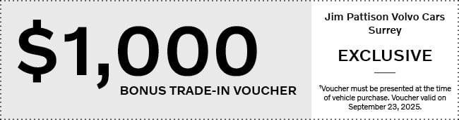 †Based on the current condition, buyout, and accident history of customer’s current vehicle. *0.49% lease/finance rate (includes 1.5% reduction from Targeted Loyalty Program) applicable to qualifying customers on new 2025 XC40 B5 AWD Ultra models for up to 48/84 months, provided through Volvo Car Canada Limited on approved credit. The Volvo Targeted Loyalty Program is for eligible customers that currently lease or finance a Volvo through Volvo Car Financial Services. **$10,000 cash purchase savings applicable on new 2025 EX90 models. ¹Trade-in bonus/voucher must be mentioned or presented at the time of vehicle purchase. ‡All customers who register and attend the event will be entered to win 1 of 2 Apple 11” iPad A16 128GB (Value: $499+tax), 1 of 3 Apple AirPod 4 (Value: $179+tax), 1 of 5 $100 gas card, or 1 of 4 $500 Save-on-Foods gift card. The draw for the prizes will be made within a week after the sales event ends from those who registered for the event, and the winner will be contacted accordingly. The winner of the contest will be required to correctly answer a skill-testing question before the prize will be awarded. No cash value. Offers valid on September 23, 2025 only. Some conditions and restrictions may apply. Errors and omissions excepted. Offers subject to change or cancellation without notice. Contact Jim Pattison Volvo Cars Surrey for complete details. Dealer #30601.
